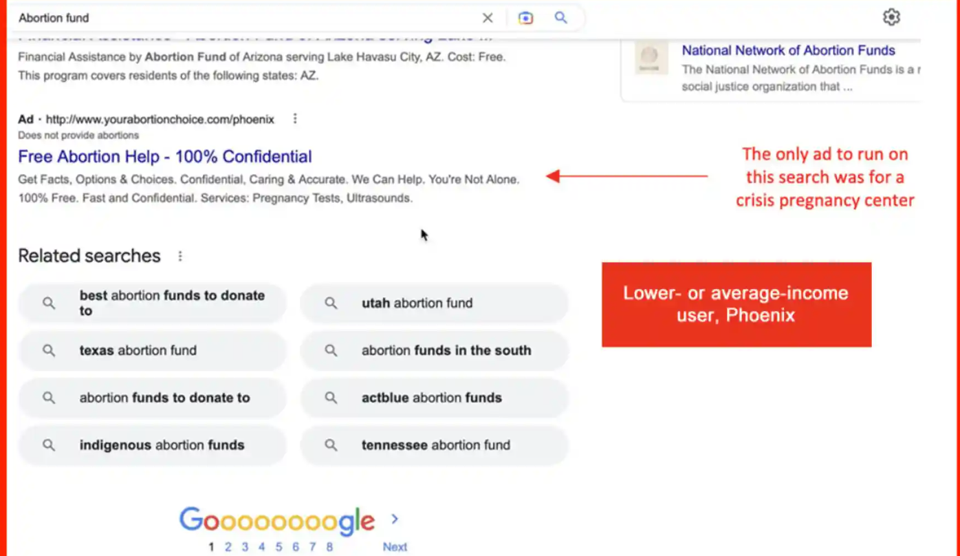 In Phoenix, a Google search by a lower- or average-income test account for “Abortion fund” – an organization that provides financial and other forms of support for abortions – yielded an ad with the text “Free Abortion Help – 100% Confidential”, for a crisis center.