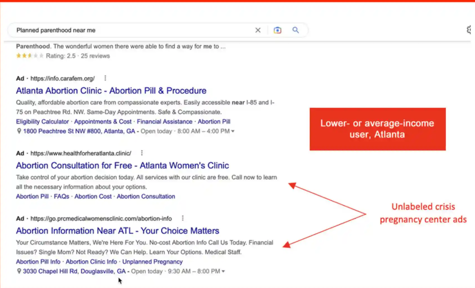 Similarly, when the lower- or average-income Atlanta test account searched for “Planned Parenthood Atlanta”, Google produced a single ad that read “Abortion Consultation for Free”, with an ad linking to a crisis pregnancy center called Health for Her in Atlanta. Although some of the ad results in the Tech Transparency Project’s study included a label stating “Does not provide abortions”, this one, along with several others, did not – in contravention of Google’s own labeling rules.