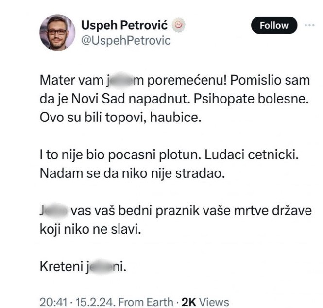 ' Mater vam j*bem poremećenu! Pomislio sam da je Novi Sad napadnut. Psihopate bolesne. Ovo su bili topovi, haubice. I to nije bio počasni plotun. Luđaci četnički. Nadam se da nitko nije stradao. J**o vas vaš bijedni praznik vaše mrtve države koji niko ne slavi. Kreteni j*bem i” - objavio je na svojem profilu.