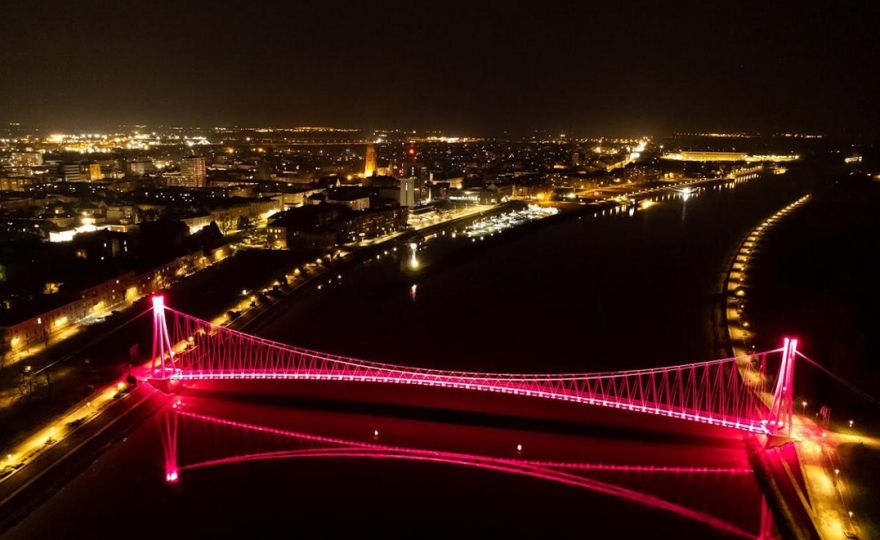 U subotu navečer, osječki Pješački most zablistao je u ružičastoj boji trešnjina cvijeta, pridružujući se međunarodnoj "Sakura kampanji" povodom Ljetnih olimpijskih igara gluhih (Deaflympics) 2025. u Tokiju.