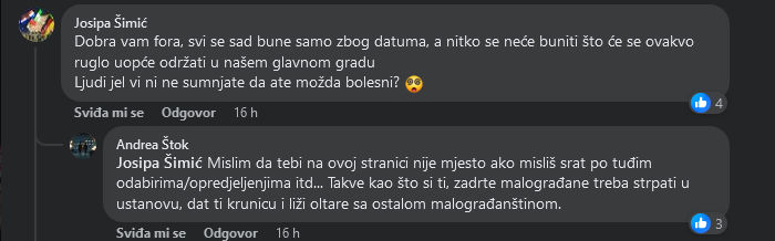 Čak se i iz komentara mogu pročitati svjetonazori onih koji zagovaraju održavanje ovog festivala, zaključite sami. Oni traže toleranciju, ali ni oni sami ne toleriraju nikoga i ljude nazivaju "zadrtim malograđanima koje treba strpati u ustanovu"!