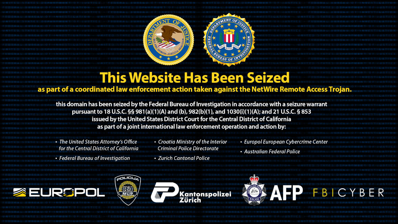 - Nalog za zapljenu navedene mrežne stranice odobrio je magistratski sudac SAD-a (United States Magistrate Judge). U nekim zlonamjernim kampanjama počinitelji su koristili NetWire (trojanac) za kibernetičke napade na zdravstvene i bankarske djelatnosti. Također je zabilježeno da je zlonamjerni software koristila skupina prevaranata iz Afrike koji su koristili NetWire za preuzimanje daljinske kontrole nad zaraženim računalima - kazali su u MUP-u. Inače u međunarodnoj policijskoj akciji osim MUP-a i FBI-a sudjelovale su i Federalna policija Australije, Kantonalna policija iz Züricha te EUROPOL koji je inicijalno i prikupio podatke koji su doveli do pokretanja međunarodne akcije.