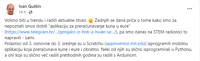Praktički istu takvu aplikaciju za preračunavanje eura i kuna, izuzev ušminkanog dizajna, napravili su i klinci iz STEM radionice u Pazinu, koju vodi nastavnik Ivan Guštin. Prema objavi u Facebook grupi Pazin IT, klinci u grupi, čija dob se kreće od trećeg osnovne do trećeg razreda srednje škole, isprogramirali su aplikaciju u Scratchu na AppInventor.mit.edu, a stariji u Pythonu. Neki su za to vrijeme radili s Arduinom, jer im je ovo bilo prejednostavno.