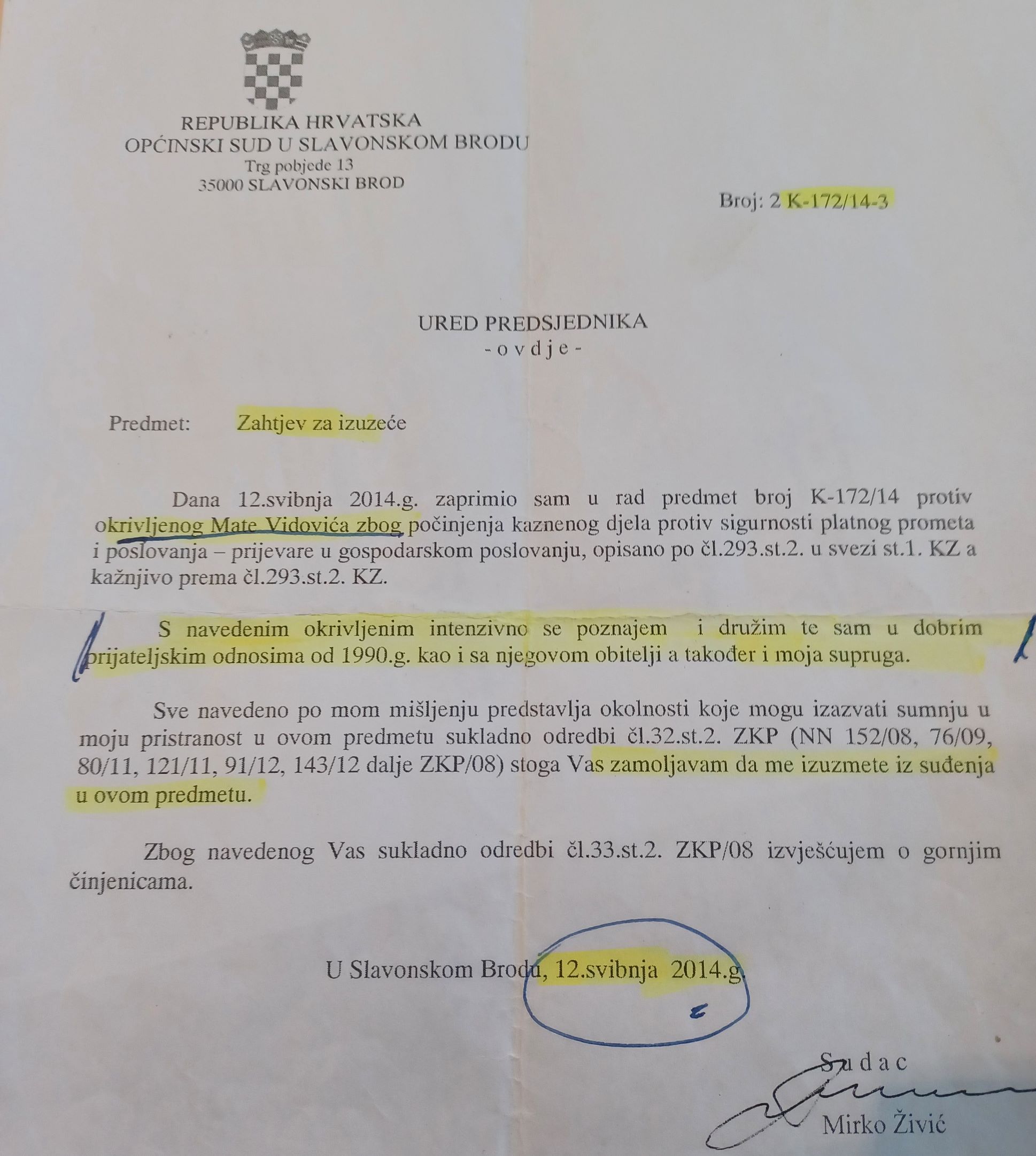 Još nešto u prilog tezi o opsega farsi u hrvatskom pravosuđu s naglaskom na Županijski sud u Slavonskom Brodu. Sudac Mirko Živić je u kaznenom predmetu broj 2 K – 172/14 – 3 protiv okrivljenika Mate Vidović tražio izuzeće od suđenja jer kako kaže s istim se “intenzivno poznaje i druži te je u dobrim prijateljskim odnosima od 1990. godine kao i s njegovom obitelji, a također i njegova supruga”.