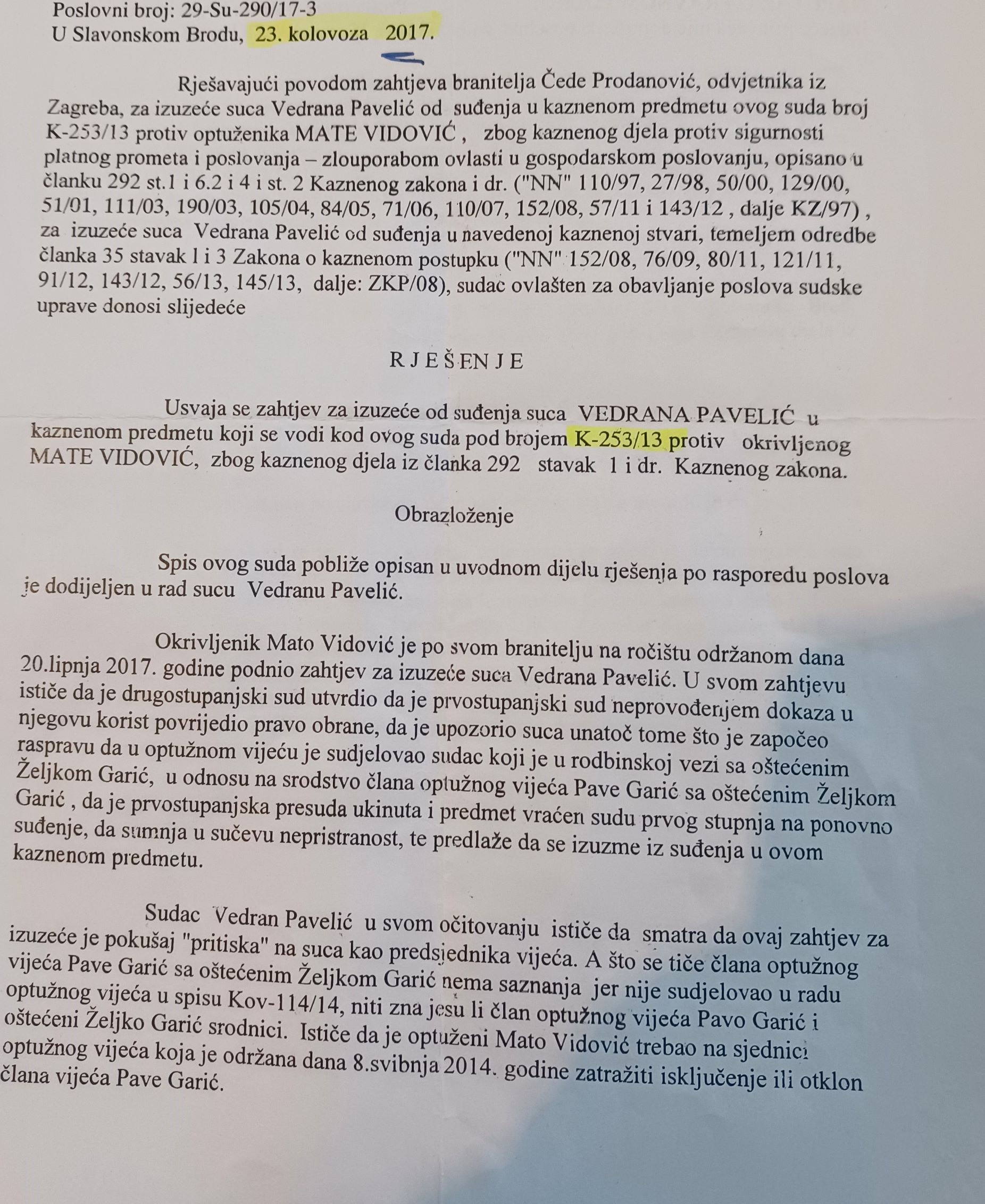 Nadalje taj isti Mirko Živić kao vd predsjednik Općinskog suda u Slavonskom Brodu je na prijedlog Čede Prodanović izuzeo od suđenja suca Vedrana Pavelić u kaznenom predmetu broj K – 253/13 protiv Mate Vidović samo na temelju navoda Čede Prodanovića, iako se sudac Vedran Pavelić protivio ovom izuzeću.