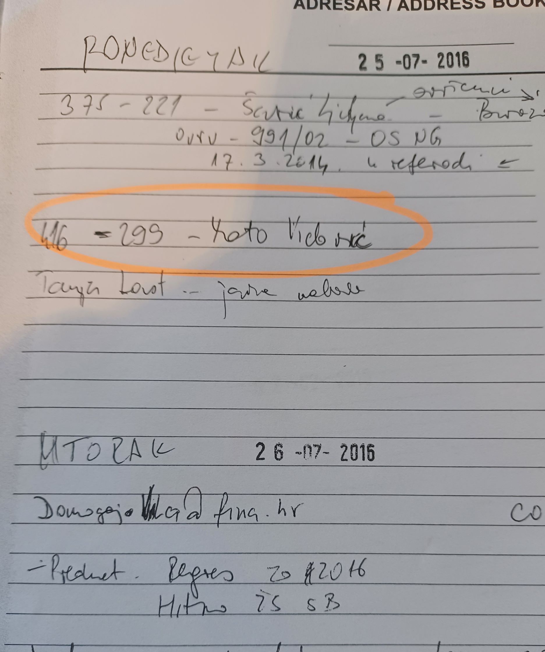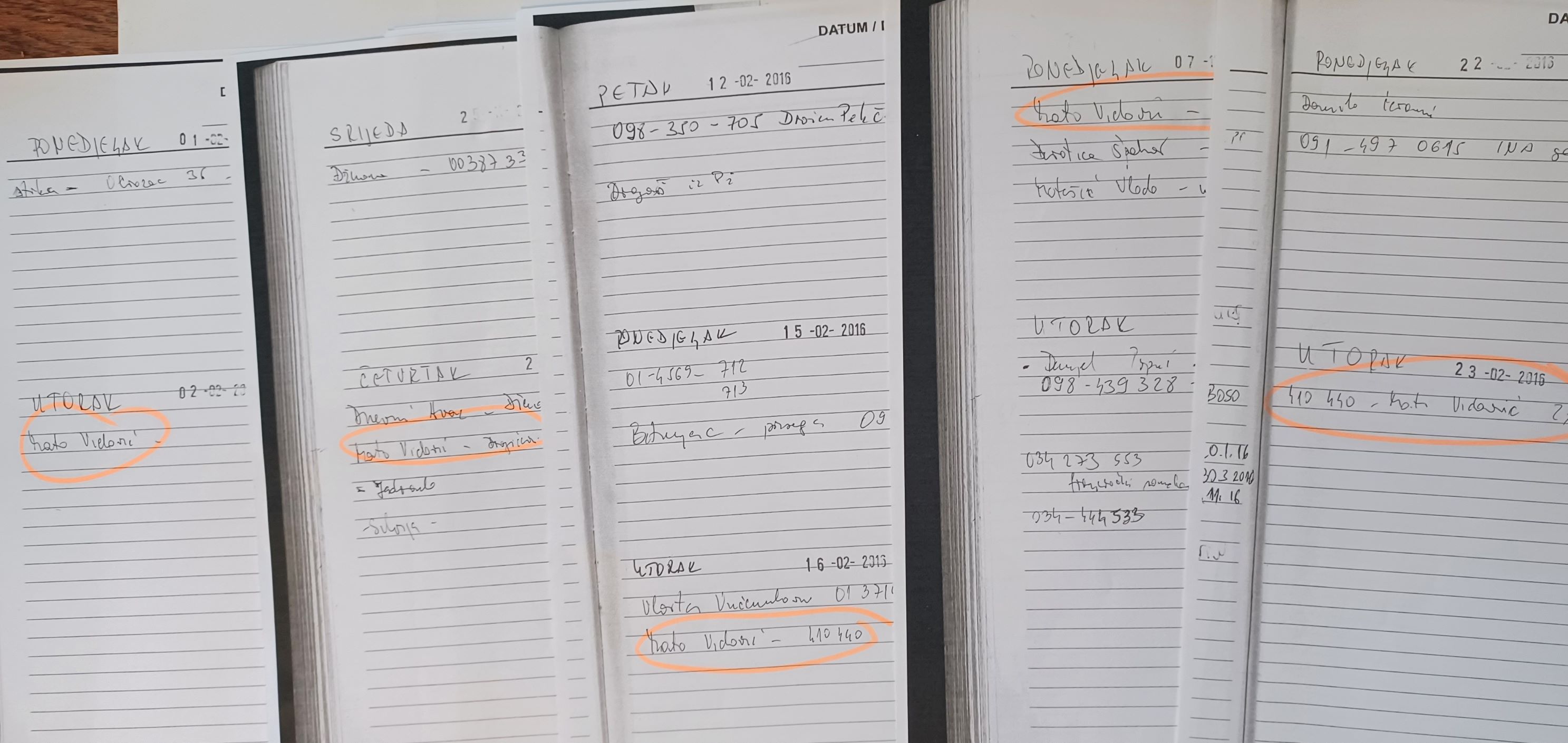 Prema evidenciji voditelja ureda predsjednika suda Mato Vidović u razdoblju od 26.11.2015. do 25.07.2016. dolazi kod Predraga Dragičević u ured u Slavonskom Brodu 7 puta i 12 puta ga zove telefonom.