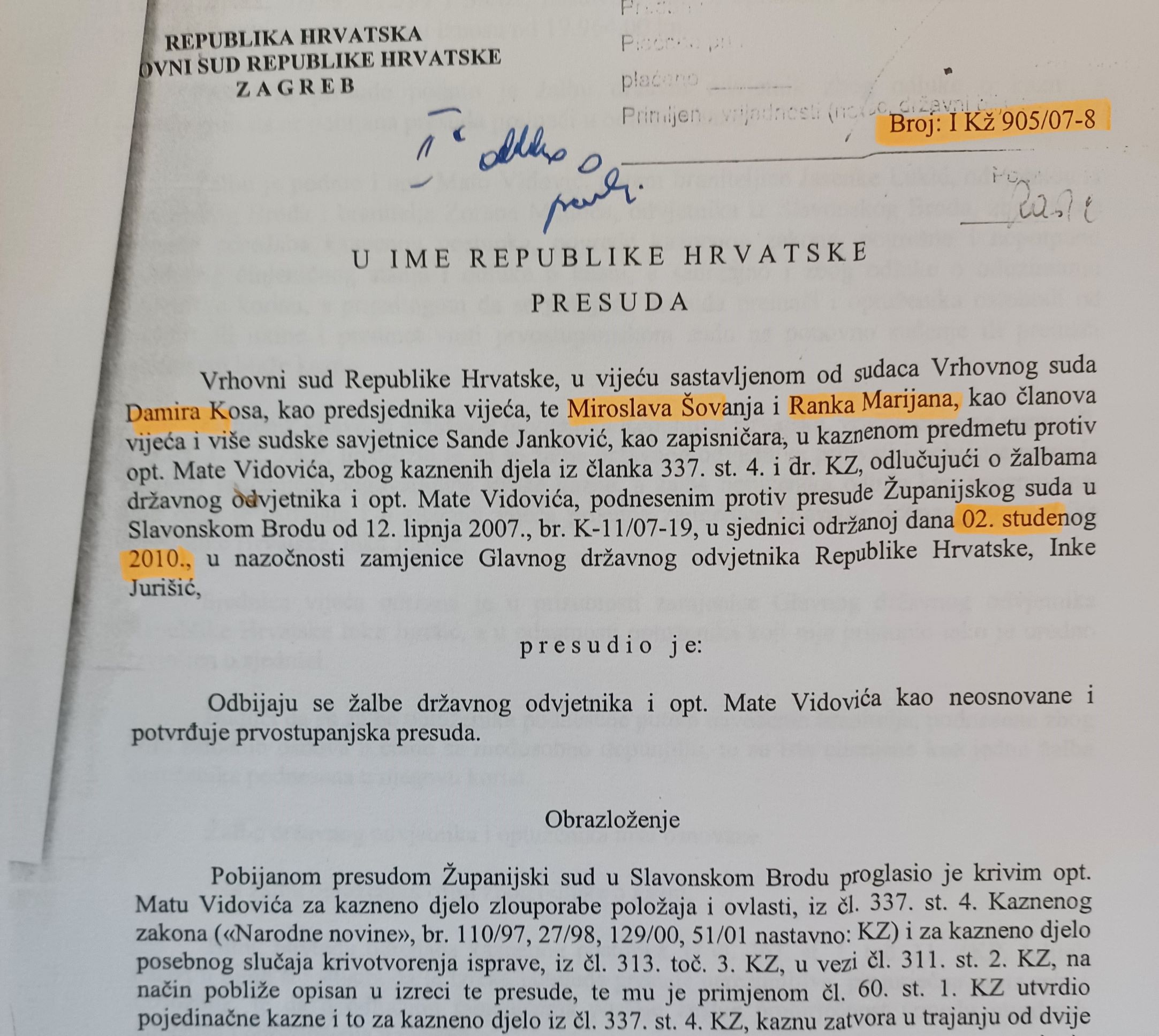 U povodu optužnice Županijskog državnog odvjetništva u Slavonskom Brodu i njene izmjene a predmetu Županijskog suda u Slavonskom Brodu broj K-11/07 protiv Mate Vidović zbog kaznenog djela zlouporabe položaja i ovlasti održane su tri rasprave : 09.05.2007., 11.05.2007. i 12.06.2007. kada je rasprava dovršena i presuda objavljena.