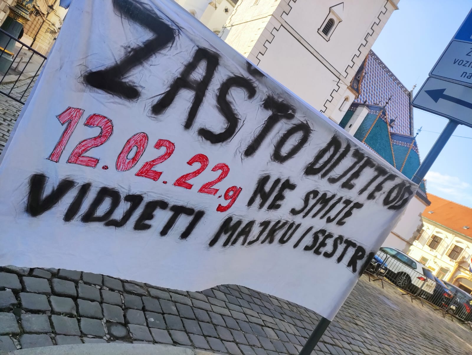 Uoči sjednice hrvatske vlade ispred Nacionalne i sveučilišne knjižnice pažnju je privlačio transparent, odnosno plahta na kojoj je ispisano: Zašto dijete od 12.02.2022. ne smije vidjeti majku i sestru.