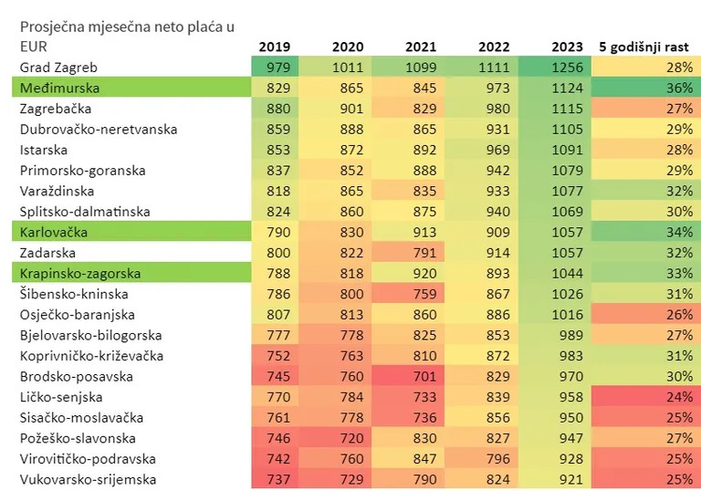 Županije koje su zabilježile najveći rast plaća su Međimurska (+36%), Karlovačka (+34%) i Krapinsko-zagorska (+33%), dok su županije s najmanjim rastom Ličko-senjska (+24%), Sisačko-moslavačka (+25%), Virovitičko-podravska (+25%) te Vukovarsko-srijemska (+25%).