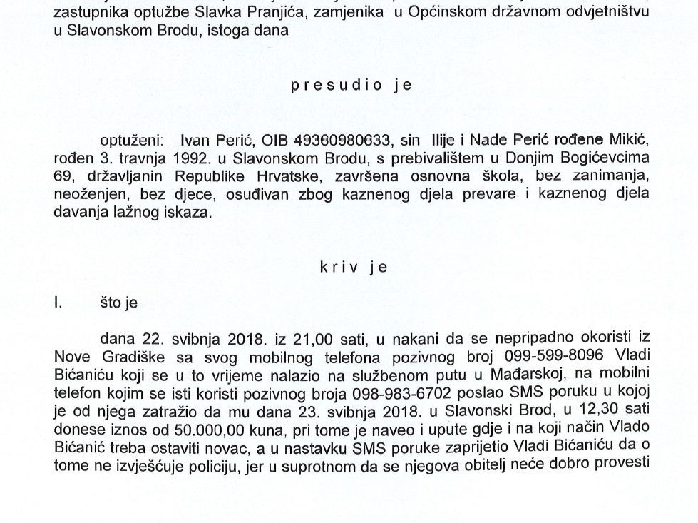 Novogradiškom poduzetniku Vladi Bičaniću Perić je poslao SMS poruku tražeći od njega da mu u Slavonski Brod donese 50.000 kuna dajući mu upute gdje i na koji način novac mora ostaviti.