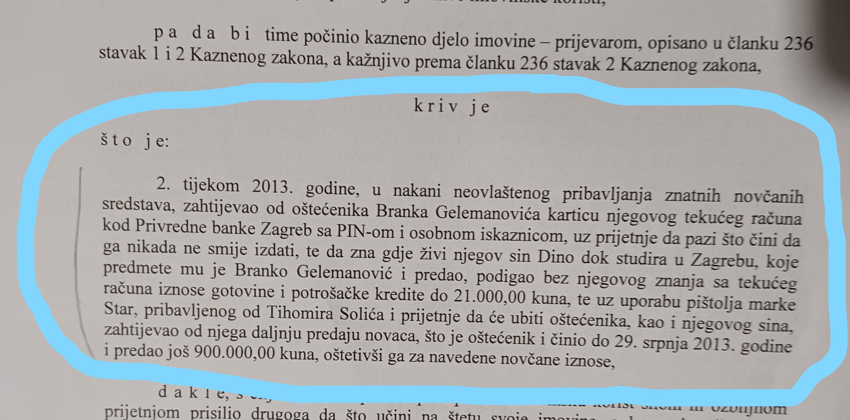 Ali ima i goreg od toga. Crona.hr je u posjedu presude iz 2017.godine u kojoj je Perić proglašen krivim jer je pištoljem prijetio Gelemanoviću i njegovom sinu riječima da „zna gdje Gelemanovićev sin živi u Zagrebu“ te od Gelemanovića dobio karticu tekućeg računa i PIN i podigao 21.000 kuna !