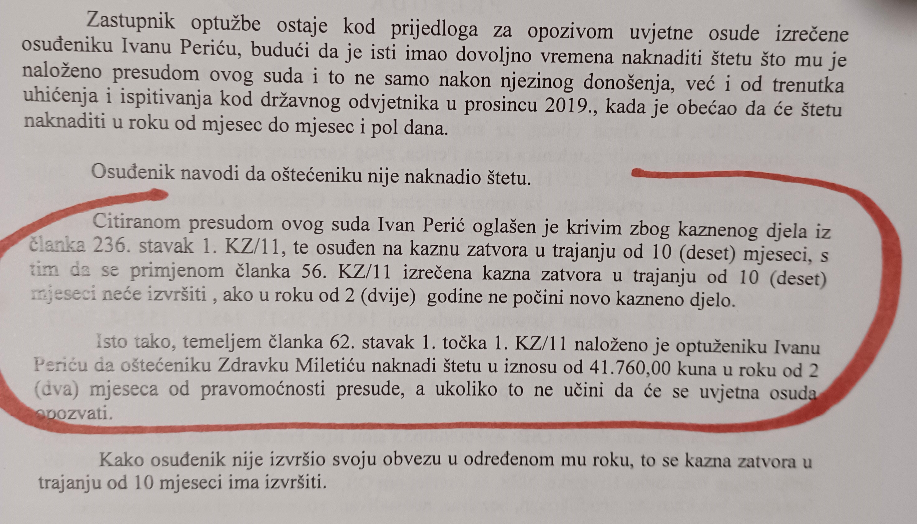 Portal Crona,hr je u posjedu preslike Perićeve osude, i naišli smo na pravu „bombu“ koja vrijeđa bilo čiji zdravi razum, ali ne i Drage Hedla i Jerka Zovaka. Naime, u presudi stoji da ukoliko Perić u roku dva mjeseca vrati oštećenom Zdravku Miletiću iznos za koji ga je prevario NE IDE U ZATVOR već se kazna mijenja u uvjetnu od dvije godine. Iznos koji je Perić trebao vratiti je 41.760 kuna !