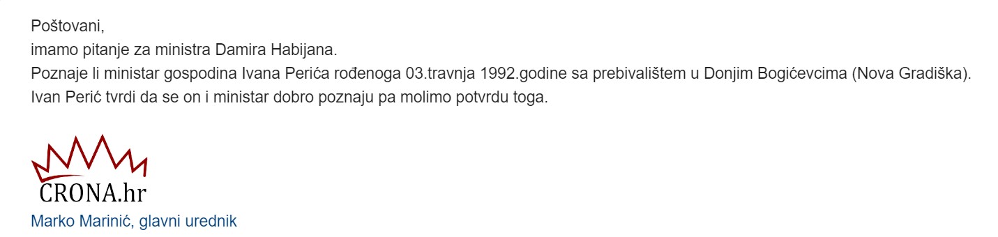 Tu informaciju smo pokušali provjeriti, pa smo ministru Habijanu prije mjesec dana službeno poslali pitanje poznaje li on uopće Ivana Perića. Nije nam odgovorio.