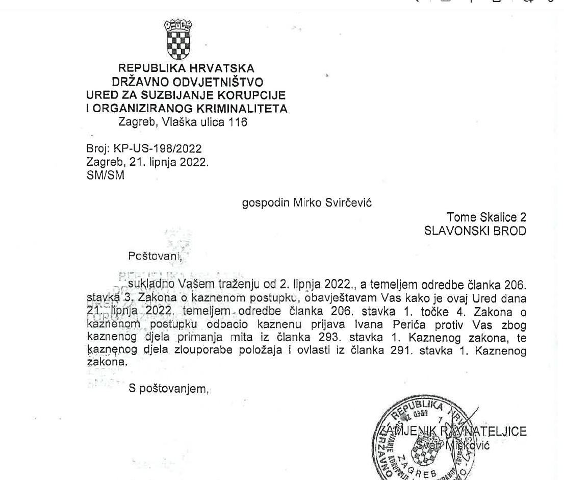 Perić se javio Hedlu i opisao mu kako je slavonskobrodskog suca Mirka Svirčevića podmitio sa 30.000 kuna, pa još sa 1000 eura izvjesnog Petra kojemu ga je Svirčević navodno uputio radi pribavljanja lažne liječničke dokumentacije , pa potom još sa 500 eura Svirčevića što je ukupno otprilike 41.000 kuna. Sudac Svirčević je te novce po Perićevom iskazu tražio kako bi mu odgodio odlazak u zatvor. Perić je sa istim navodima podnio i kaznenu prijavu USKOK-u. Perić je pravomoćno osuđen za prijevaru na kaznu od deset mjeseci zatvora, te je tražio odgodu odlaska na izdržavanje kazne i za to je Svirčeviću, po njegovim riječima, platio oko 41.000 kuna.