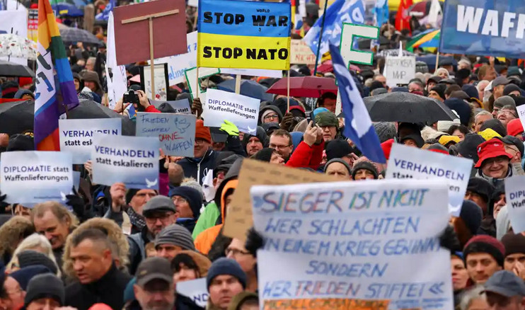 Prosvjednici su nosili transparente na kojima je pisalo: 'Danas kacige, sutra tenkovi, prekosutra vaši sinovi', u vezi s načinom na koji je koalicijska vlada povećala svoju vojnu potporu Kijevu, u početku donirajući 5000 kaciga, a nedavno pristajući poslati njemačku napravio tenkove Leopard II.