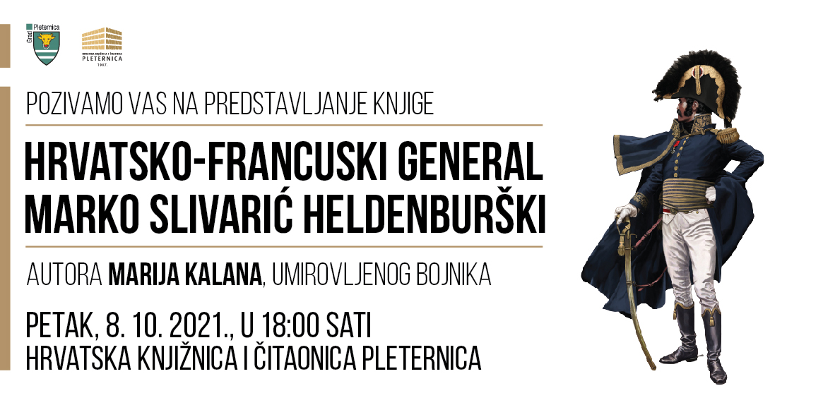 U petak, 8. listopada 2021., u Hrvatskoj knjižnici i čitaonici u Pleternici održat će se predstavljanje knjige Hrvatsko francuski general Marko Slivarić Heldenburški čiji je autor Mario Kalan.