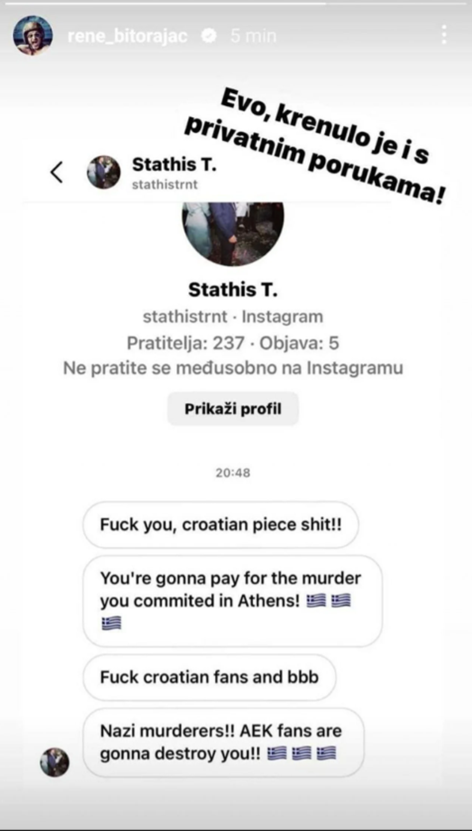 "Je*i se smeće hrvatsko! Platit ćeš za ubojstvo u Ateni. Je*eš hrvatske navijače i BBB! Nacistički ubojice, AEK-ovi navijači će vas uništiti!", piše u poruci koju je primio.