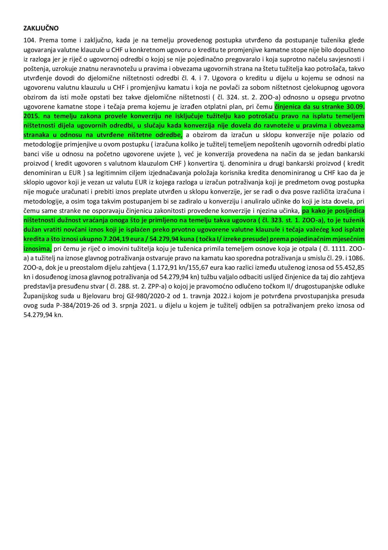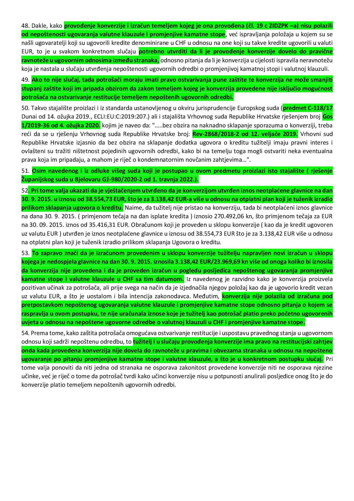 1. Potrošač ima pravo na obeštećenje, ako konverzijom nije dobio sve ono što mu pripada na temelju izuzeća ništetnih ugovornih odredaba. Vještačenjem je utvrđeno da konverzijom nisu vraćeni preplaćeni anuiteti, da nije plaćena niti pripadajuća zatezna kamata te da je preostala glavnica nakon konverzije veća za oko 10 % od glavnice na koju potrošač ima pravo izuzećem ništetnih odredaba.