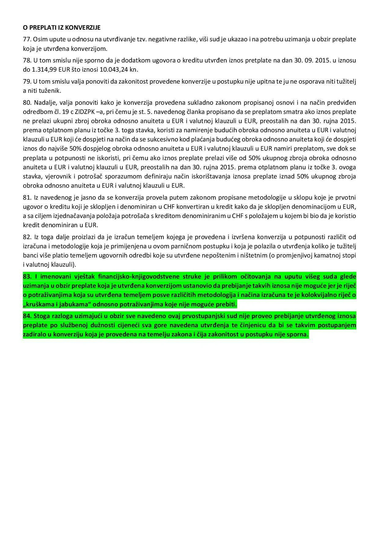 Mi bismo samo na to dodali, ako bi možda jednom Vrhovni sud ipak odlučio da se preplate iz konverzije moraju odbiti od preplaćenih anuiteta, onda je to odbijanje moguće samo od zateznih kamata, jer se dospjeli dugovi vraćaju tako da se najprije plaćaju zatezne kamate, pa tek potom vraća glavnica duga. U skladu s time, preplata iz konverzije može se odbiti samo od zateznih kamata dospjelih do dana konverzije.