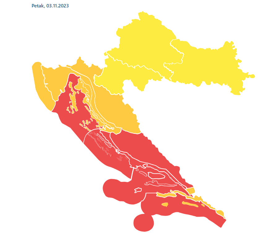 Za dubrovačku i gospićku regiju, kao i za Velebitski kanal i zapadnu obalu Istre na snazi je narančasto, dok je u unutrašnjosti na snazi žuto upozorenje.