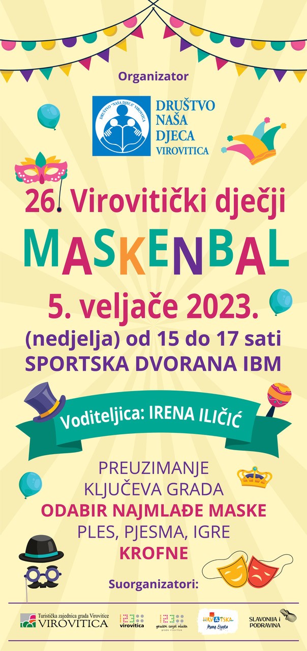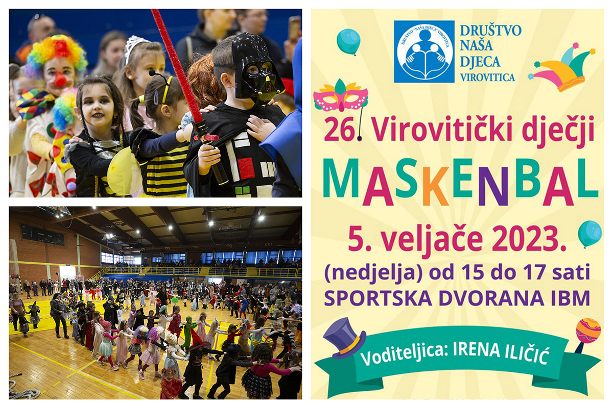 U organizaciji Društva Naša djeca Virovitica, Turističke zajednice grada Virovitice, Grada Virovitice i Gradskog savjeta mladih u nedjelju, 5. veljače, od 15 do 17 sati, u sportskoj dvorani Osnovne škole Ivane Brlić-Mažuranić održat će se 26. po redu Virovitički dječji maskenbal.