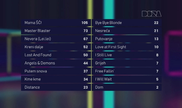 Pjesma 'Mama ŠČ!' je pobijedila zbrojem glasova stručnoga žirija te gledatelja i slušatelja Hrvatske radiotelevizije, a bila je prva i po glasovima žirija (104 boda) i po glasovima publike (174 boda), osvojila je ukupno 279 bodova. Prestižnu statuu Dore, rad umjetnika Ivice Propadala Let 3 je na pozornici uručila prošlogodišnja pobjednica Dore Mia Dimšić.