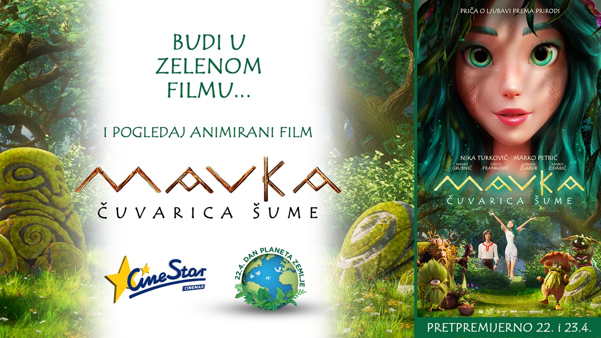 Prati zelenokosu vilu Mavku čija je primarna misija zaštiti šumu I njezino sveto srce od bilo kakve agresije ili napada, uključujući I one od strane ljudi. Osim poučno - zabavne filmske avanture za cijelu obitelj koja na velike ekrane dolazi pretpremijerno u sva CineStar kina u Hrvatskoj, u CineStaru Zagreb Branimir Mingle mall će u subotu 22.4. biti organiziran i bogat edukativno - zabavni program za djecu. U lobbyu kina posjetitelje će dočekati prava zelena šuma te mnoge kreativne eko radionice kao što su jumbo podna bojanka, izrada i oslikavanje pamučnih vrećica, a posebno iznenađenje koje će dodatno obradovati najmanje je prava vila Mavka koja će se družiti s djecom 22. i 23.4. od 11 – 17 h. Također prije ove pretpremijera projekcije za koju su ulaznice u prodaji, na velikom platnu će biti premijerno prikazan spot za naslovnu pjesmu “Mavka: šumska pjesma” u izvedbi Nike Turković i Marka Petrića. Povodom Mavke i Dana planeta Zemlje, CineStar je i svoje digitalne ekrane u kinima I profile na društvenim mrežama obojio u zeleno, a edukativnim porukama posjetiteljima naglašava važnost očuvanja prirode.