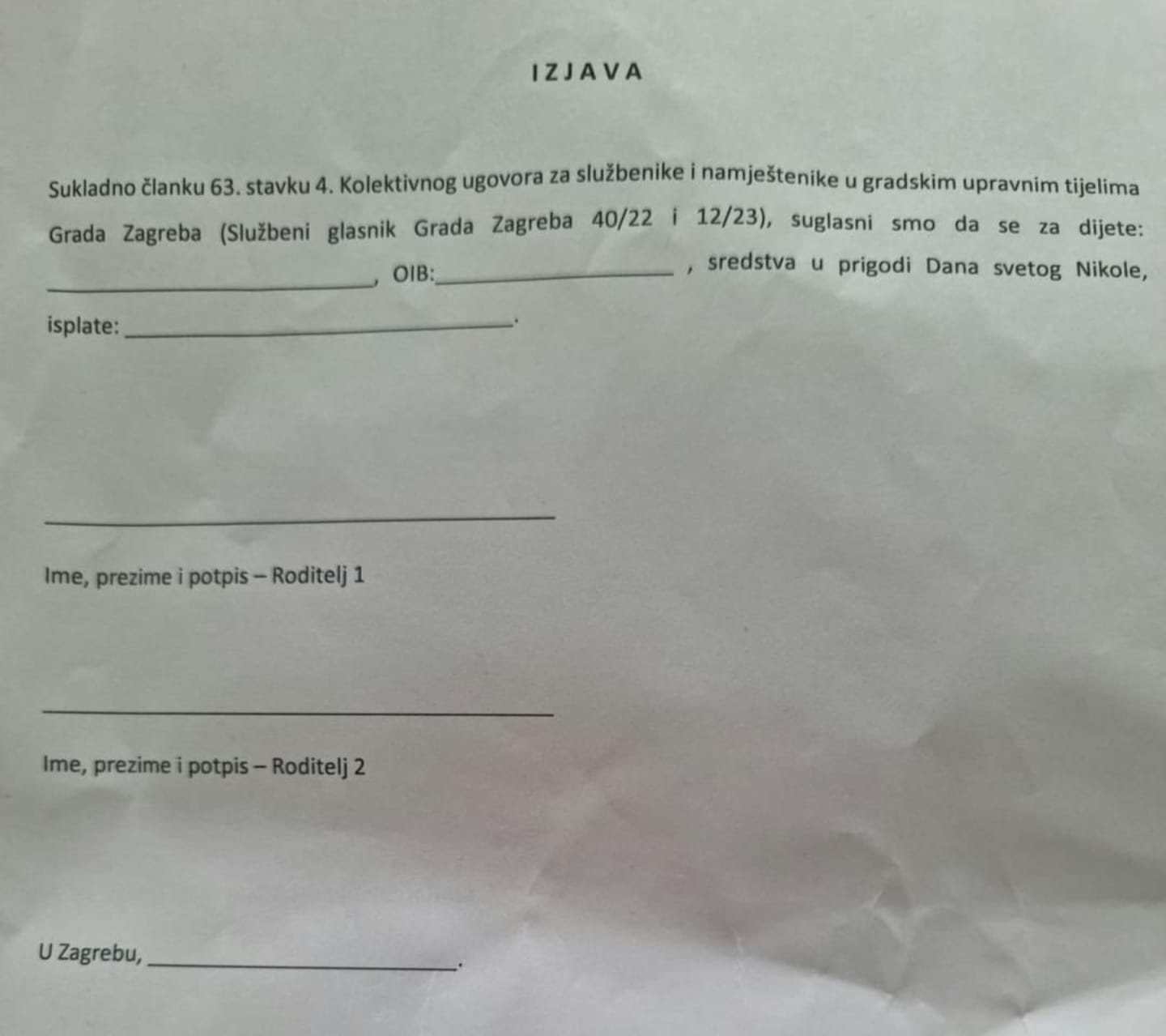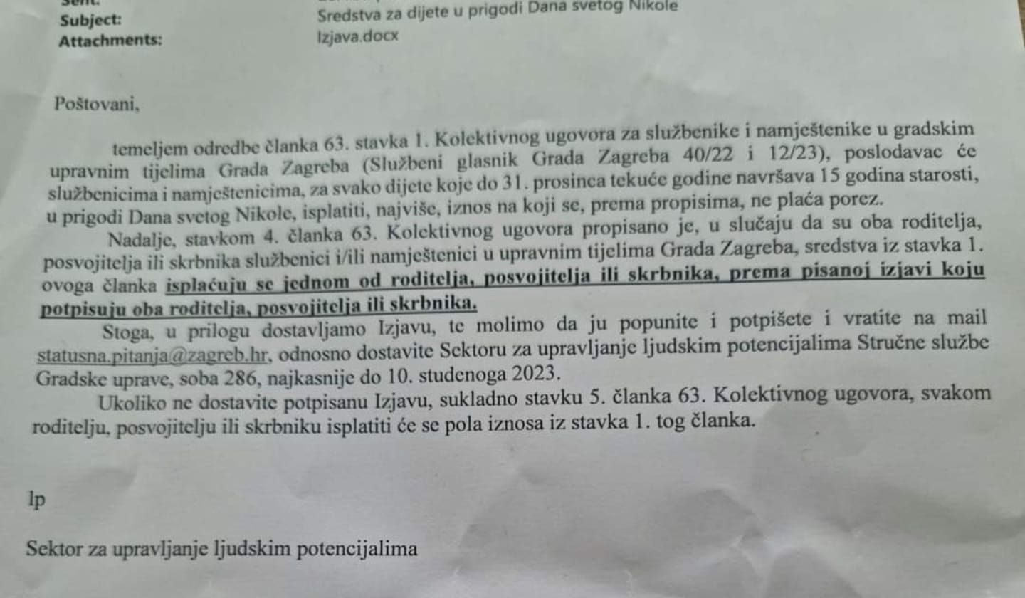 Kao što se vidi iz priloženih dokumenata Grad Zagreb će kao poslodavac temeljem Kolektivnog ugovora službenicima i namještenicima za svako dijete mlađe od 15 godina isplatiti novčani dodatak prigodom Dana svetog Nikole.
