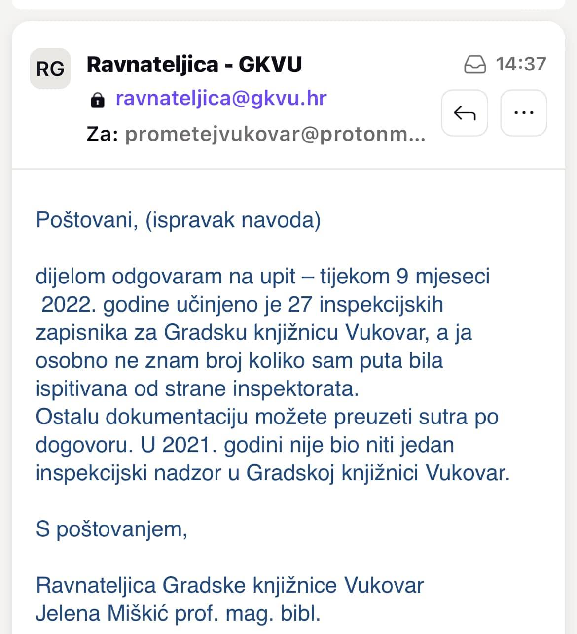 Poslavši u knjižnicu službeni upit po Zakonu o pravu na pristup informacijama s pitanjem; Koliko je bilo inspekcijskih nadzora u Gradskoj knjižnici Vukovar tijekom 2021. godine, a koliko tijekom ove 2022. godine?
