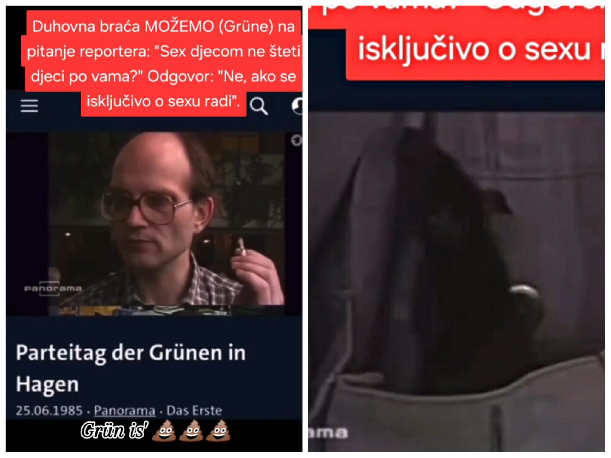 Još od 80-ih, predstavnici Grüne na javnoj njemačkoj televiziji nisu samo branili pedofiliju, već su je i zagovarali, šokantno tvrdeći da "nesmije se nikoga izostaviti". Za duhovnu braću stranke 'Možemo', očigledno je važnija ideologija i seksualno iživljavanje nego zaštita djece od štete koja im se nanosi pedofilskim radnjama. Ne trebamo se čuditi tome da upravo 'Možemo' financira razne udruge duginih boja.