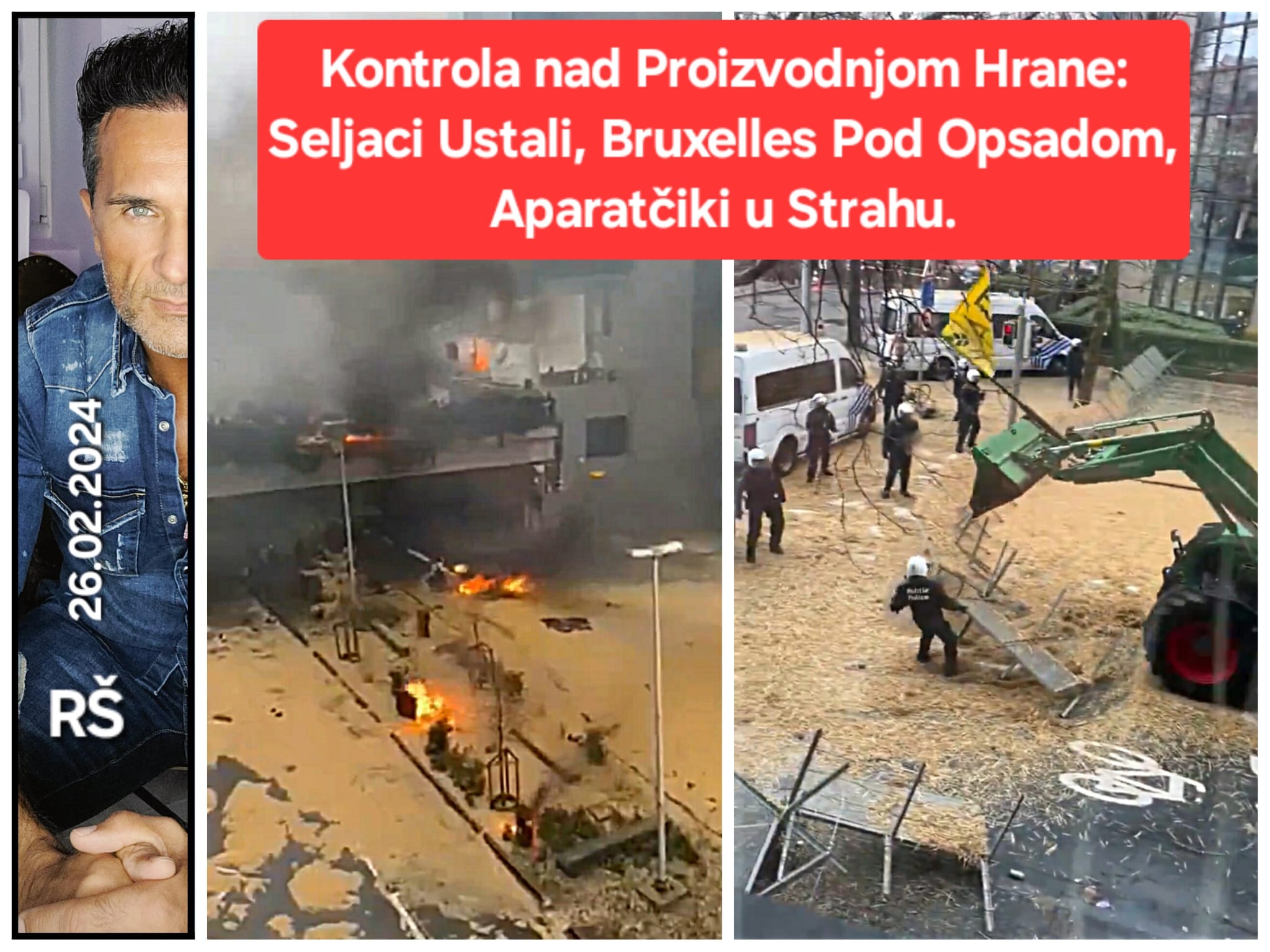 Europski seljaci se bore za pravo na tradicionalnu proizvodnju hrane bez "milijun" socijalističkih regulacija, odbacujući pokušaje EU-a da nametne kontrolu i institucionalizira raspodjelu hrane. Ova bitka nije samo za hranu, već za slobodu od birokratskih okova koji prijete da uguše njihovu proizvodnju. Dok se seljaci probijaju kroz kontrolne točke, jasno je da se Belgija, nakon Njemačke, Francuske, Poljske, Nizozemske, Italije itd., suočava s više od samo prolazne pobune. To je simbolika otpora protiv pokušaja EU-a da nametne svoju volju nad onima koji hrane kontinent. Dok se poljoprivrednici bore za proizvodnjom prirodne hrane, frikovi poput Bill Gatesa plješću aplauz, jer kada ne bude bila više dostupna prirodna hrana, onda će doći njegovo GMO smeće, kukci i umjetno meso na naše stolove. Njegovi profiti bit će astronomski a naš izbor bit će uzmi ili umri.