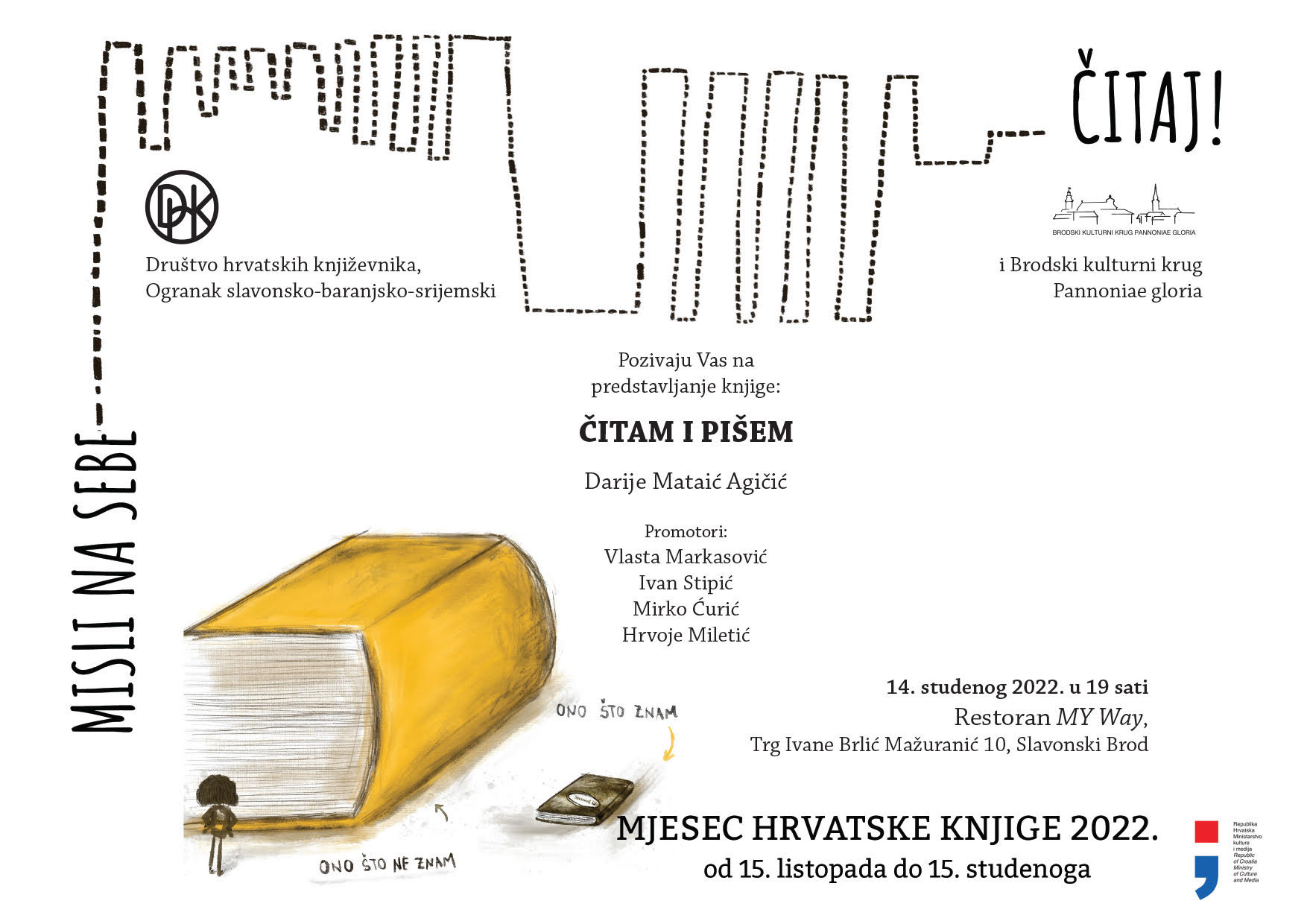 Predstavljanje knjige „Čitam i pišem“ biti će 14.studenoga 2022. (ponedjeljak) u Restoranu MY Way na brodskom Korzu.