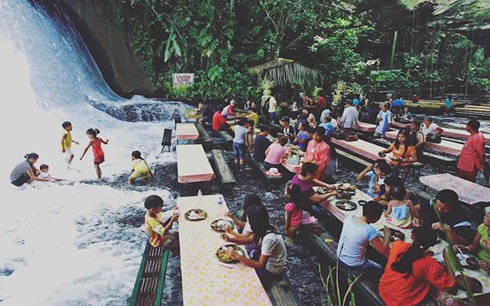 Posjetitelji uživaju u autentičnoj domaćoj kuhinji i ručaju za stolovima od bambusa. Noge im se ispiraju kristalno čistom vodom. Što ima više osvježenja u ovoj vlažnoj klimi! Vodopad koji teče radi kao prirodni klima uređaj.