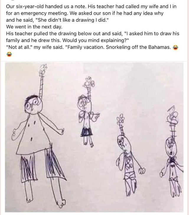 Učenici su dobili zadatak da nacrtaju sebe i svoju obitelj, a rad ovog šestogodišnjaka poprilično je zabrinuo učiteljicu koja je odmah sazvala hitan sastanak s njegovim roditeljima. Iza poprilično mračnog i šokantnog crteža zapravo se krije urnebesno objašnjenje! Najbolje da sami pogledate priču roditelja: