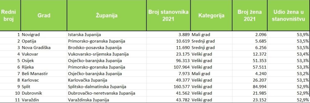 Nakon Novigrada, u kojem ih je 53,9 posto, najviše žena u odnosu na ukupni broj stanovnika je u Opatiji i Novoj Gradiški – 53,5 posto, Vukovaru – 53,4 posto, Osijeku i Rijeci – 53,3 posto, Belom Manastiru – 53,2 posto, Karlovcu – 53,1 posto, Splitu – 52,9 posto i Dubrovniku i Varaždinu – 52,9 posto. Tu su još Makarska, Sisak i Crikvenica u kojima je 52,8 posto ženske populacije te Hvar, Koprivnica, Hrvatska Kostajnica, Pakrac i Zadar sa 52,7 posto žena.