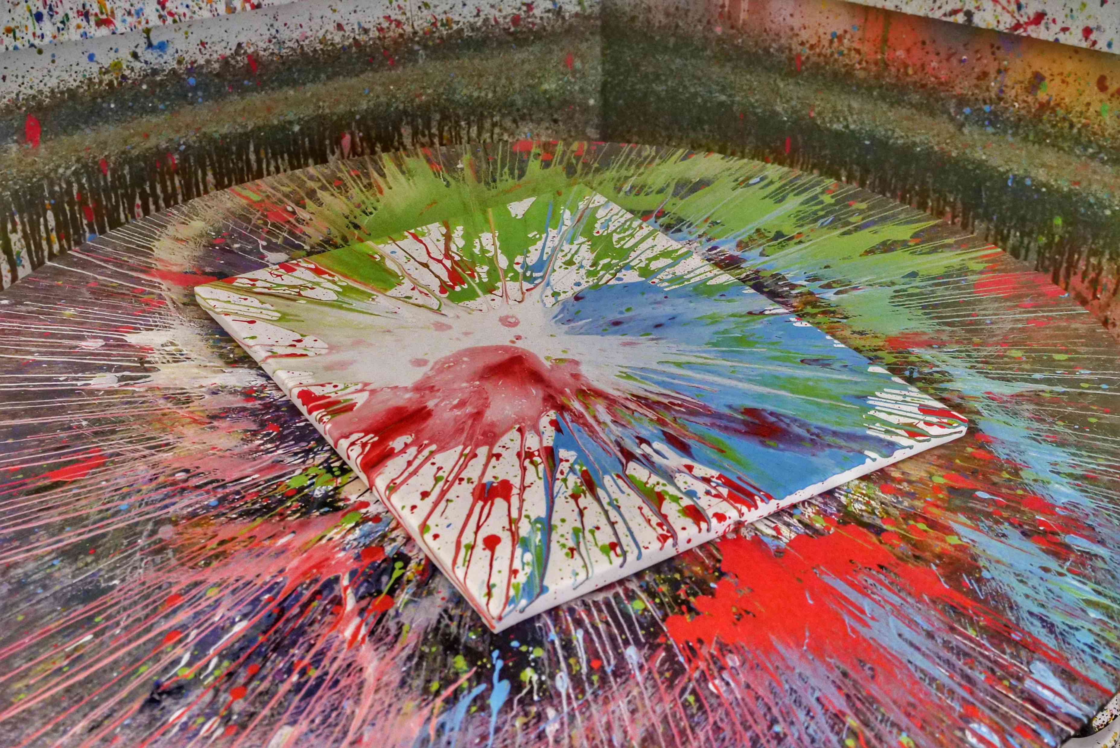 sa stropa studija. U njih se puca pištoljem na zrak uz zadovoljene sigurnosne mjere, te ta boja onda pada na platno koje se još dodatno vrti velikom brzinom kako bi boja koja je na njemu stvorila efekt eksplozije.