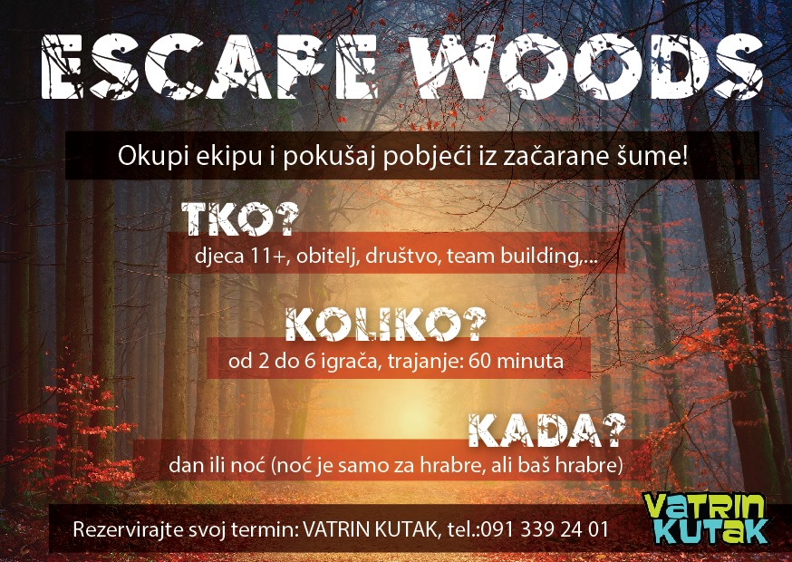 Svi smo već čuli za escape room i napetu zabavu traženja tragova kako bi pobjegli iz dobro osmišljene zamke. Bili smo detektivi, zatvorenici, slučajni prolaznici pred koje je stavljena misterija koju samo dobar tim može uspješno savladati i pronaći izlaz. Međutim, dali ste dovoljno spretni i hrabri pobjeći van Začarane šume? U Zaprešiću će vam se pružiti prilika da se okušate u novoj vrsti izazova i neopisive zabave za mlađe i zrelije igrače. Od raznovrsnog zabavnog sadržaja koji nudi Vatrin kutak, ističe se prvi Escape izazov na otvorenom, pod nazivom Escape Woods! Osim što je u ovom nesretnom periodu pandemije ovakva igra na otvorenom poželjna, osim zdravstvene sigurnosti nudi i nezaboravan doživljaj za one najhrabrije! Noćni ili dnevni termin ovisno o razini vaše neustrašivosti, provest će vas kroz avanturu u kojoj ćete morati pronaći dijelove slagalice kako bi izmakli nesretnoj sudbini.