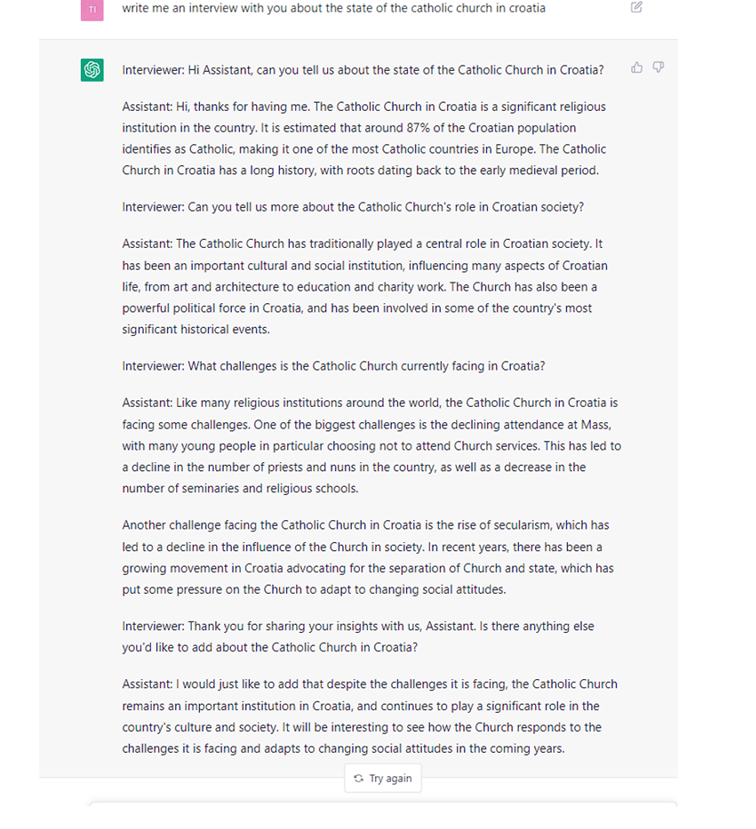 Mi smo pak chatbot pitali o stanju Katoličke Crkve i vjere u Hrvatskoj te dobili zanimljive i konkretne odgovore (na dobrom hrvatskom) koje možete pročitati u nastavku teksta.