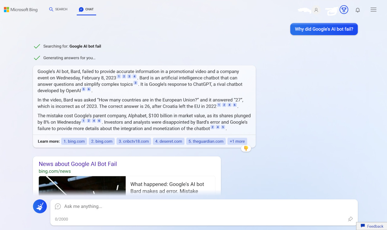 Na pitanje o broju članica EU-a, Googleov Bard odgovorio je točno - 27, dok je Microsoftov Bing AI elegantno izbacio Hrvatsku. Da bi stvar bila još bolja, odgovorio je kako je Hrvatska izašla 2022. godine i još je kao izvore za tu informaciju naveo svoje rezultate pretraživanja. Problem je što, kad se klikne na izvore informacija koje Bing navodi, tamo nema ni riječi o tome da je Hrvatska izašla iz EU-a, a među izvorima nema onog koji je najrelevantniji - službenih stranica Europske unije.