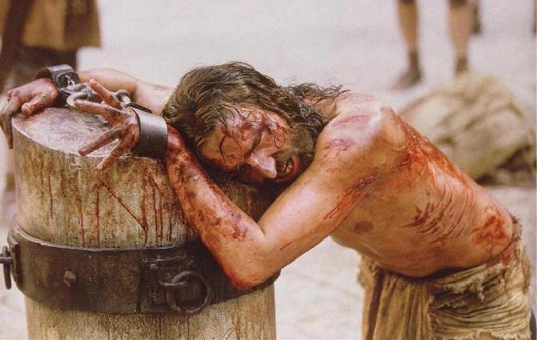 Kad smo snimali scene bičevanja, okruživale su me tri kamere, a između su se nalazila ogledala kako bih mogao vidjeti udarce koji dolaze. Svaki put kad je vojnik zamahnuo bičem, reagirao sam kao da me uistinu udara. Mel je rekao glumcima da zamahuju bičem kao da igraju bejzbol. Za vrijeme snimanja jedne scene bič je promašio dasku i udario me u donji dio leđa. Mislio sam da znam kakav je to osjećaj. Nisam znao. Kad me je bič udario, oderao je dio kože s mojih leđa. Nisam mogao ni vikati. Ostao sam bez daha kao srušeni igrač u američkom nogometu. Pao sam. Mel nije shvatio što se dogodilo, vikao je: ''Jime, ustani! Jime, ustani!'' Zglobovi su mi bili vezani za stup te nisam mogao ništa napraviti.