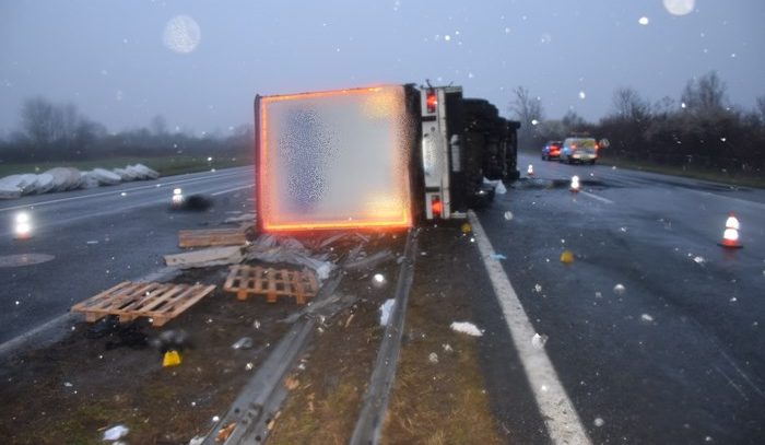 Policijski službenici su očevidom utvrdili da je vozač (r.1952.), upravljajući tegljačem sa priključenom poluprikolicom, zbog neprilagođene brzine izgubio nadzor nad upravljačem, sletio s kolnika i zahvatio travnatu površinu, gdje je je u zanošenju udario u smjerokazni stupić i rasvjetni stup, te se zaustavio na travnatoj kosini. Također je utvrđeno da vozač tijekom vožnje nije koristio zaštitni sigurnosni pojas. U ovoj prometnoj nesreći vozač je teško ozlijeđen, prevezan u bolnicu u Novoj Gradiški i zadržan na daljnjem liječenju. Policijski službenici protiv vozača podnose obavezni prekršajni nalog zbog prekršaja iz Zakona o sigurnosti prometa na cestama.