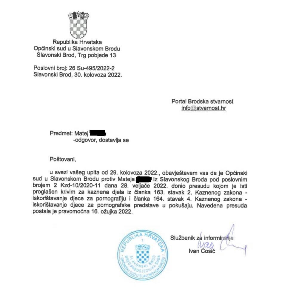 Nakon što je na suđenju počinitelj kaznenog djela M.Š. (25) priznao svoja nedjela, pravomoćna presuda koja je postala punovažeća 16. ožujka 2022. godine ga praktički oslobađa krivnje, tako da je sada već osuđeni pedofil dobio kaznu u vrijednosti “nešto malo” sati društveno korisnog rada.