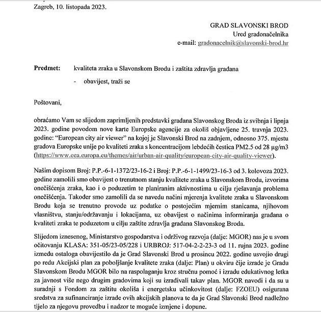 Peter Tot-Đerđ iz Eko-Integrala poslao je Striboru Valenti, predsjedniku Gradskog vijeća, ali i gradonačelniku Mirku Duspari pismo da se omogući gradonačelnikov odgovor, danas, na aktualnom satu Gradskog vijeća, a na upit poslan još 10. listopada u Ured gradonačelnika od Dijane Kesonja, zamjenice pučke pravobraniteljice “povodom nove karte Europske agencije za okoliš, objavljene 25. travnja 2023. godine: ‘European city air viewer’ na kojoj je Slavonski Brod na zadnjem, odnosno 375. mjestu gradova Europske unije po kvaliteti zraka, s koncentracijom lebdećih čestica PM2.5 od 28 ug/m3