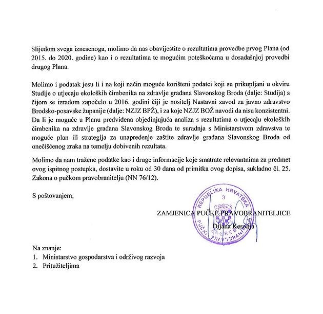 Na kraju dopisa gđa Dijana Kesonja uljudno umoljava gradonačelnika Grada Slavonskog Broda da “slijedom svega iznesenoga, molimo da nas obavijestite o rezultatima provedbe prvog Plana (od 2015. do 2020. godine) kao i o rezultatima te mogućim poteškoćama u dosadašnjoj provedbi drugog Plana.”