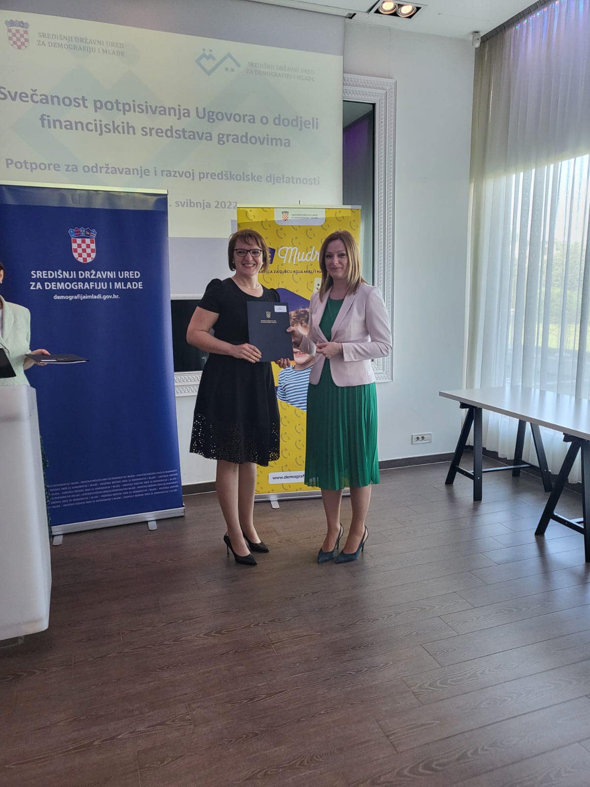 Državna tajnica Središnjeg državnog ureda za demografiju i mlade Željka Josić svečano je uručila Ugovore o dodjeli financijskih sredstava gradovima Republike Hrvatske za održavanje i razvoj predškolske djelatnosti u 2022. godini ukupne vrijednosti 6,1 milijun kuna. Financijsku potporu ostvarilo je 25 gradova, a među njima je i Pleternica.