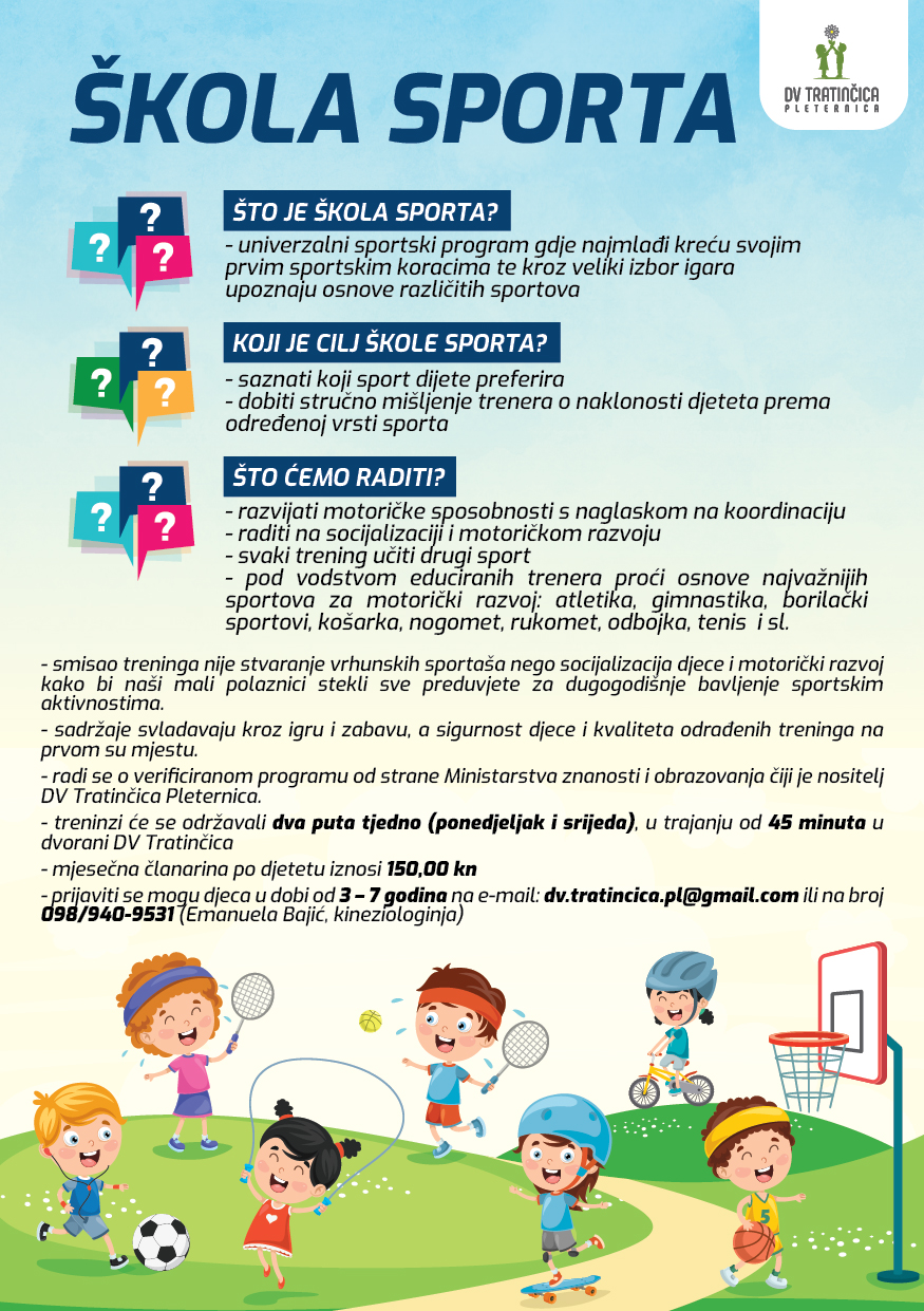 Škola sporta je mjesto na kojem najmlađi rade svoje prve sportske korake i kroz veliki izbor igara upoznaju osnove različitih sportova. Radi se o verificiranom programu od Ministarstva znanosti i obrazovanja namijenjenom svoj djeci, a nositelj programa je DV Tratinčica Pleternica. Po završetku programa djeca sama spoznaju prema kojem sportu gaje najviše interesa, a roditelji dobivaju trenerovo stručno mišljenje u kojem sportu dijete ima najveće šanse za uspjeh.