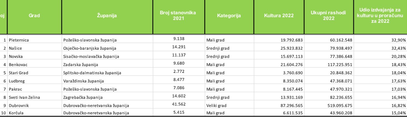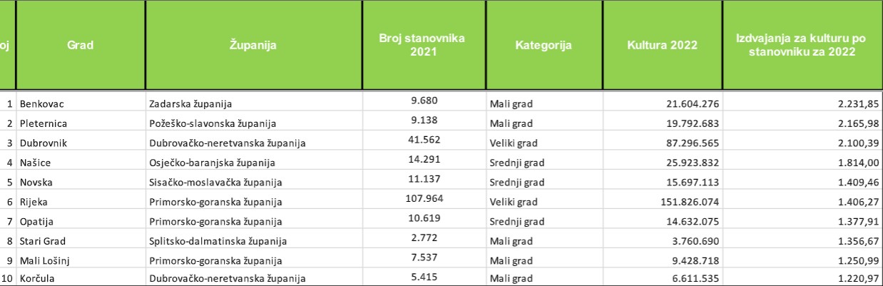 Promatramo li izdvajanja za kulturu po glavi stanovnika, prema podacima Ministarstva financija o izvršenju proračuna u 2022. najviše je izdvojio Grad Benkovac, potom Pleternica, Dubrovnik, Našice, Novska…