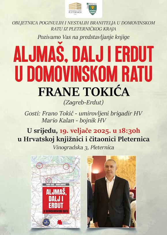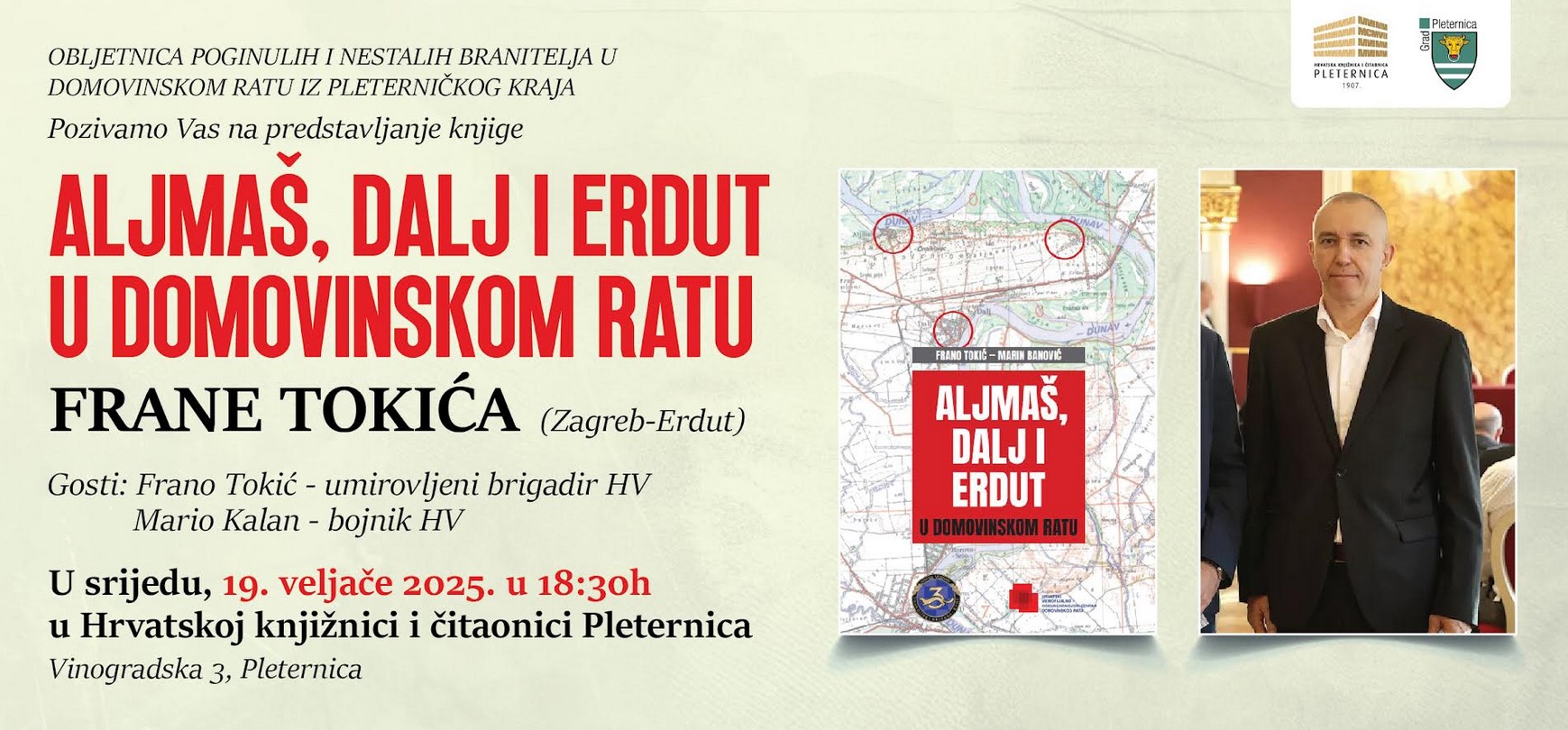 Pozivamo Vas na predstavljanje knjige "Aljmaš, Dalj i Erdut u Domovinskom ratu" autora Frane Tokića, koje će se održati u srijedu, 19. veljače 2025. godine u 18:30 sati u Hrvatskoj knjižnici i čitaonici Pleternica.