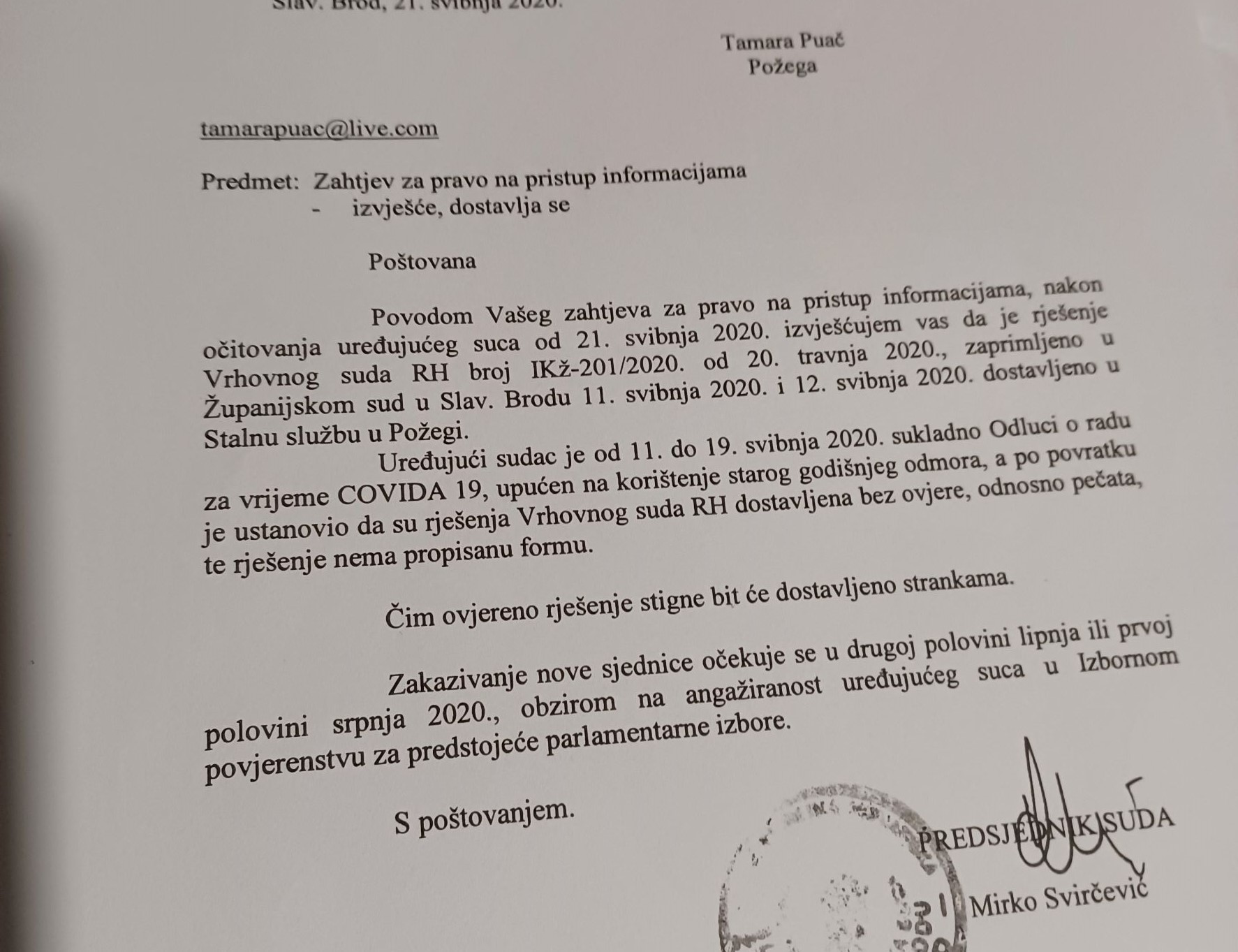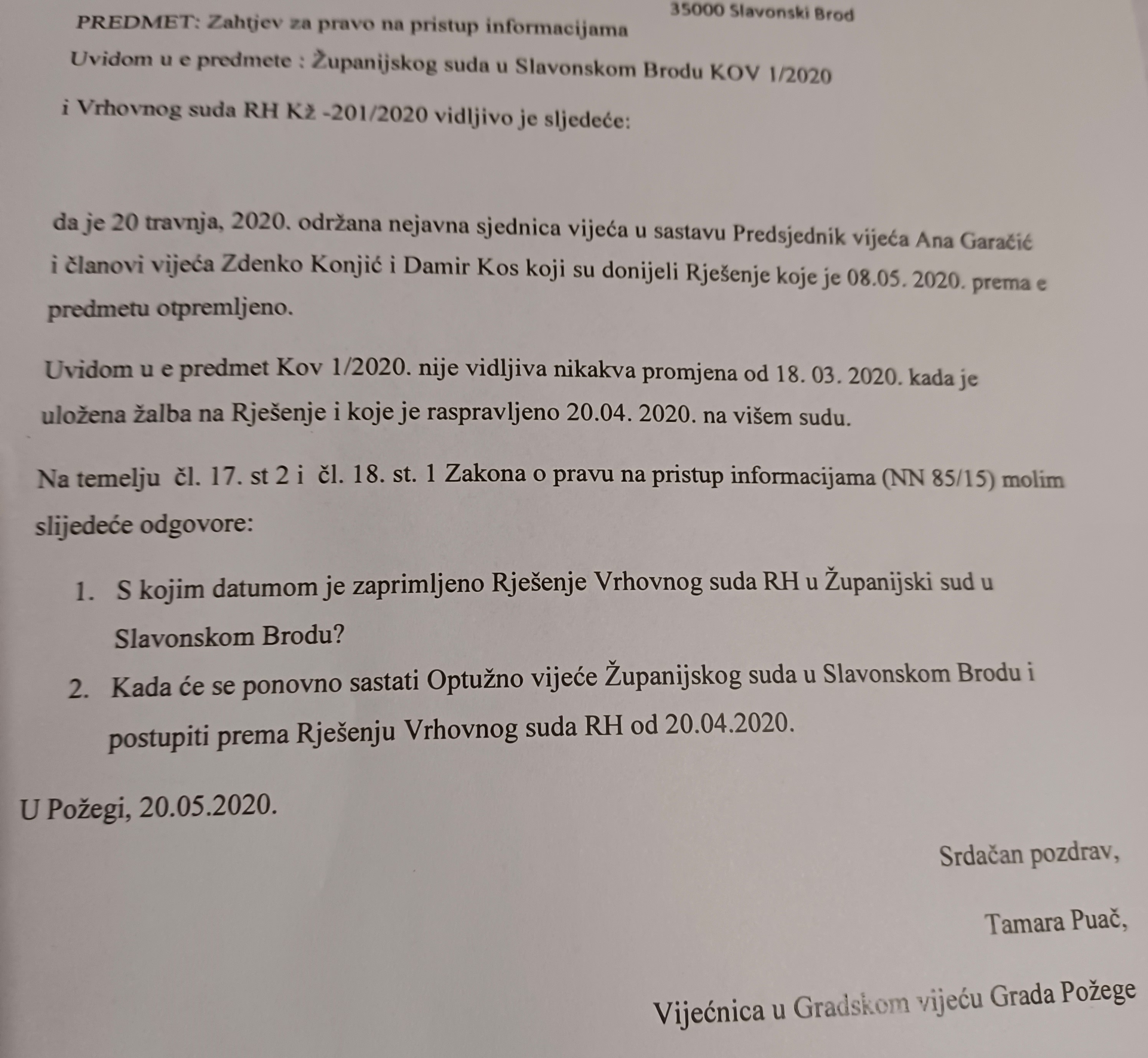 Pitanje je uputila predsjedniku Županijskog suda Mirku Svirčeviću, a ovaj ga proslijedio sucu Nenadu Vlašiću (!) koji odgovara kako se traženo Rješenje ne može provesti jer je dostavljeno bez ovjere, odnosno pečata, pa se očekuje novo.