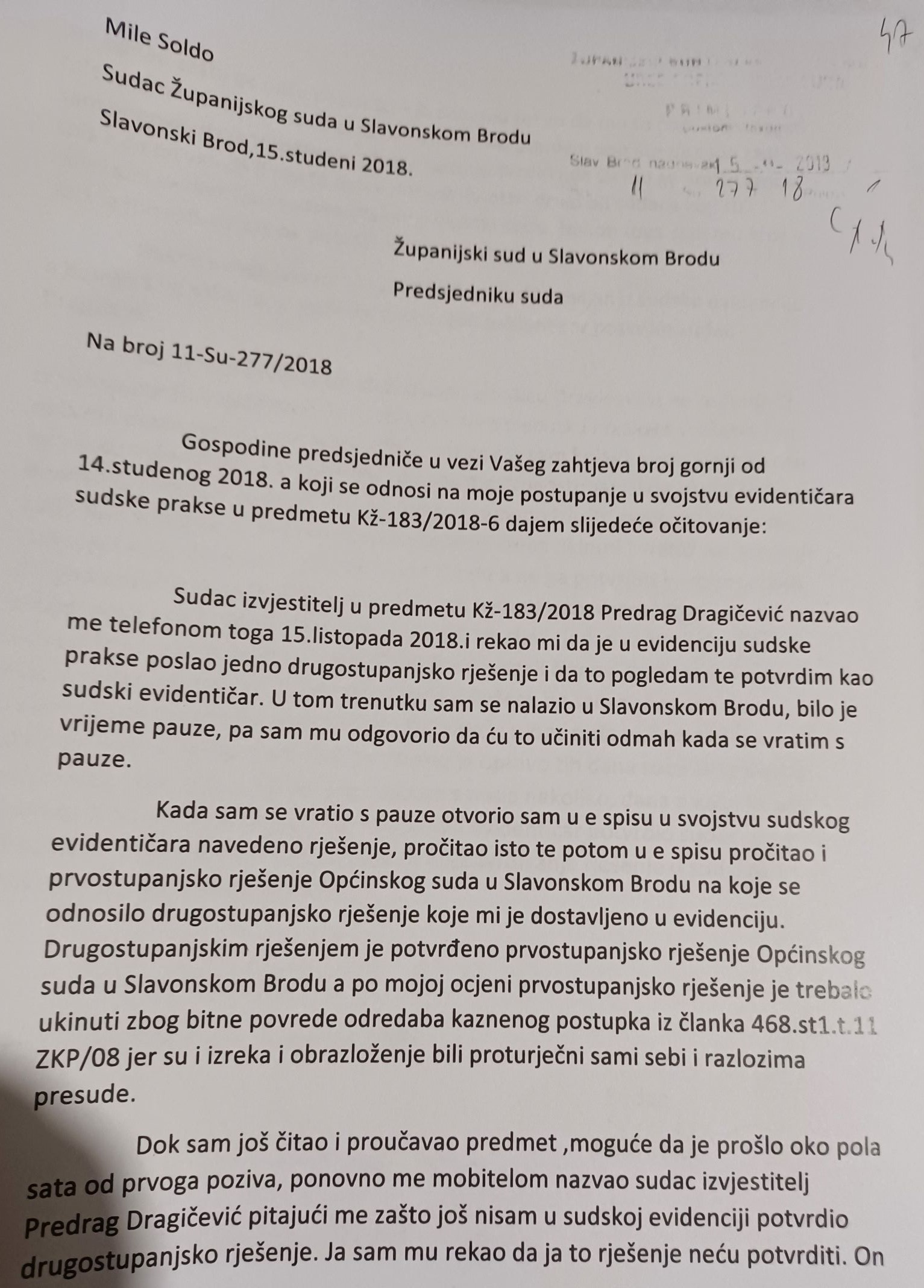 Očitovanja Mirka Solde predsjedniku Županijskog suda, a potom i istoga predsjednika USKOK-u govore o nečasnim postupcima i mogućoj korumpiranosti Predraga Dragičevića.